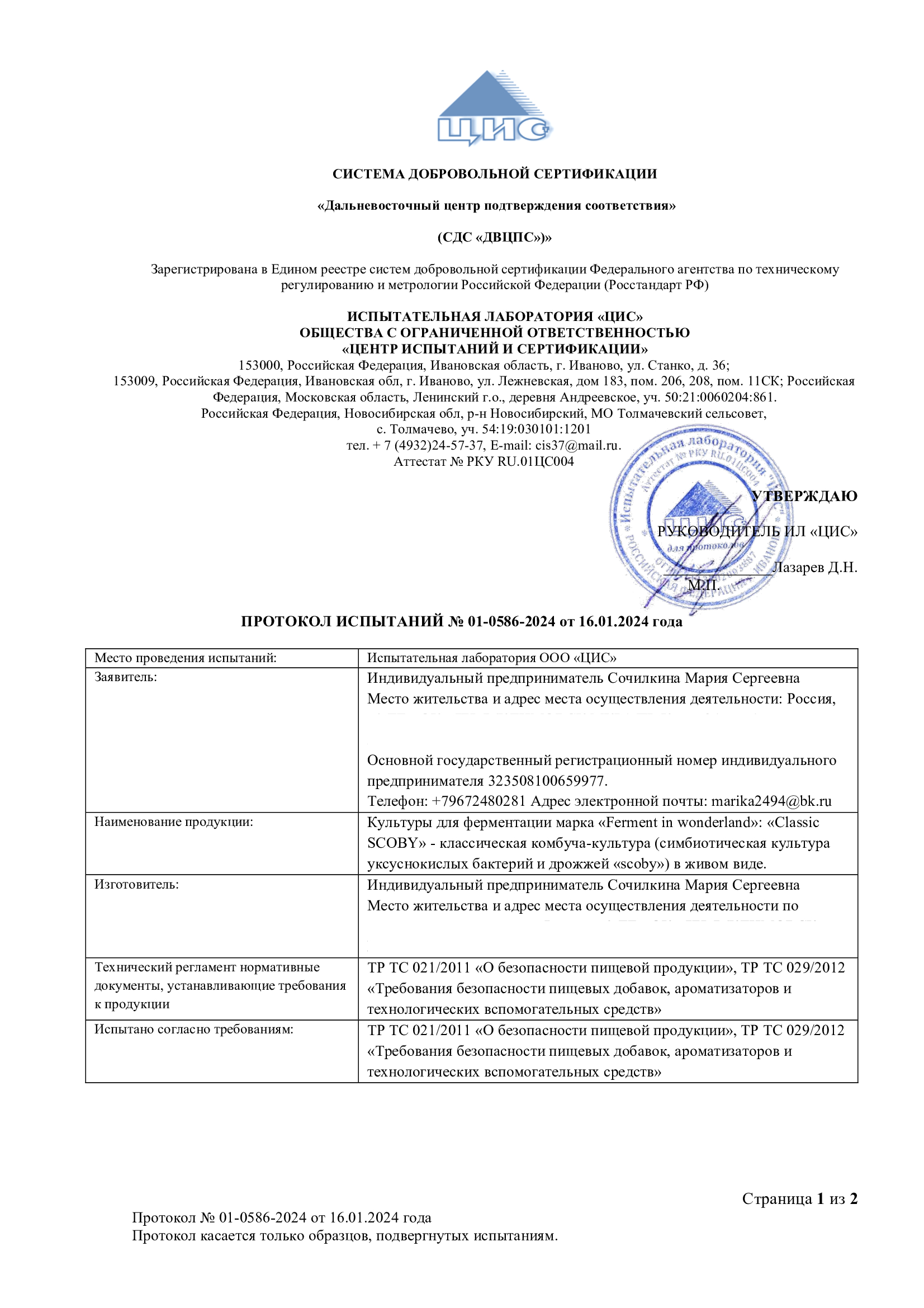 - Стартовая культура «CLASSIC-SCOBY» для литровой банки (все содержимое пакета)